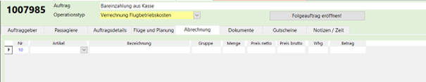 Auf der zweiten Rechnung «Charter-Flugstundenabrechnung 1005501» ist der übriggebliebene Betrag vom Abklärungskonto zurückzubuchen und oben die Leistungen mit normaler MWST (Code V77) aufzuführen. Bleibt immer noch ein Saldo, ist dieser wieder mittels Abklärungs-Konto-Buchung auf das folgende Quartal zu übertragen.