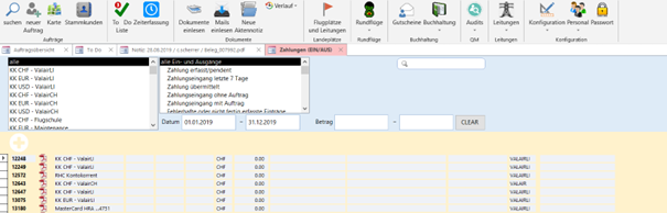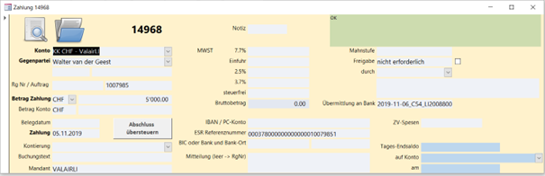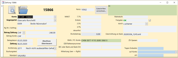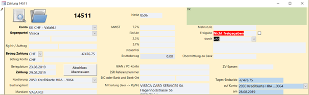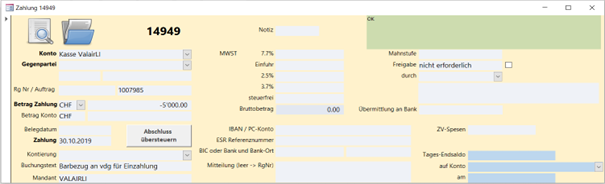 Zuerst Auftrag eröffnen und wie eine Rechnung darstellen, damit man Einzahlungsschein drucken kann. Danach Zahlung löschen und Verbuchung Kasse an KK Valair mit – verbuchen, KK Valair an Kasse mit + verbuchen, keine Kontierung Buchungstext mit Barübertrag vermerken.