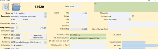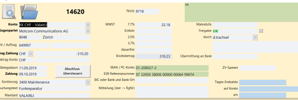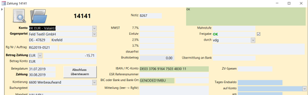 - Beleg 14141: Kontierung NIE auf 3000er Konten (ausser 3800 Erlösminderung). War auf 3400 Maintenance. Zudem stand die BIC im Feld Bankort