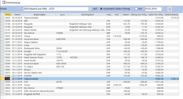 - Spesen Hansruedi: Jeweils auf sein Spesenkonto buchen («Spesen Hansruedi»). Von dort tätige ich von Zeit zu Zeit dann Zahlungen.(als Geschäftsführer steht er besonders unter Beobachtung der Steuerbehörden, deshalb möchte ich nicht zu viele Einzelzahlungen auf sein Konto).In diesem Fall erfolgt die Erfassung immer per Belegdatum = Zahlungsdatum.