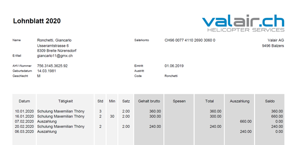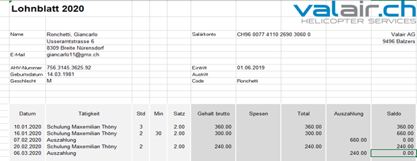 - Eingekaufte Flugschulleistungen für unsere normalen Piloten zur Ausübung ihrer Tätigkeit als AOC/SPO-Pilot: Die Mehrwertsteuer kann zurückgefordert werden, also Betrag ins Feld MWST eintragen