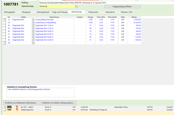 - Die Rechnung «Schuungs-Flugstundenabrechnung» (sagen wir mal, Nummer 1005500) listet den Saldo aus dem Vorquartal auf sowie alle Schulungsdienstleistungen (Code MWST V0-N). Der übrigbleibende Saldo seiner Vorauszahlung ist auf das Abklärungskonto zu buchen, Text «übertrag auf Rg 1005501»i, Zahlungsdatum = Rechnungsdatum