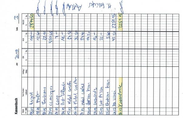 - Bauhaus-Quittungen: Wir erhalten jeweils eine Monatsrechnung, die Quittungen buchen wir nicht. Und schon gar nicht an Roger auszahlen. Auf dem Beleg steht jeweils unten «KAUF AUF RECHNUNG». Ausnahme: der Beleg von Arthur (14189), dort hat er offenbar bar bezahlt.