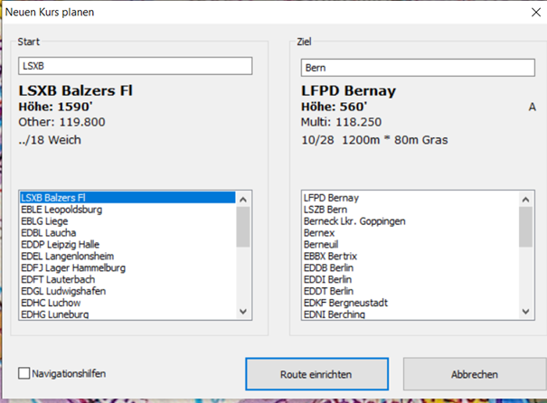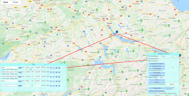 Es können beliebig neue Punkte hinzugefügt werden, wenn das Wetter zum Beispiel schlecht ist und wir an der Strasse entlang fliegen müssen. Mit rechter Maustaste kann der Punkt wieder gelöscht werden. Fluglandeplatz Bei Gemeinde anfragen ob man da landen kann, ansonsten versuchen privates Grundstück zu finden oder bei einem Flughafen.