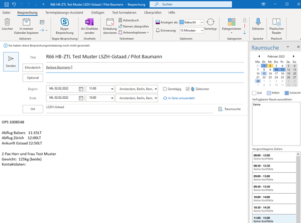 Anschliessend den Termin ins Outlook Info Valair eintragen mit folgenden Angaben: