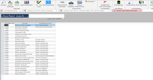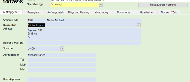 Neuer Auftrag erfassen Pilot, Instruktor und unter Stammkunde Pilot erfassen